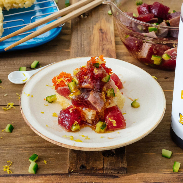 Non-GMO Soy Sauce (Water, Soybeans, Wheat, Salt), Cane Sugar, Tomato Paste, Organic Ginger, Mirin (Water, Rice, Koji Seed, Sea Salt), Green Onion, Yuzu Juice, Organic Yuzu Extract, Organic Rice Vinegar, Organic Garlic, Sea Salt, Organic Toasted Sesame Oil.