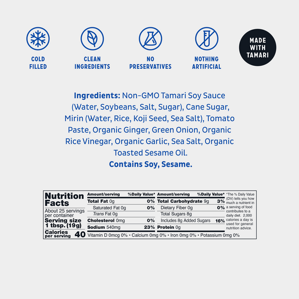 Non-GMO Tamari Soy Sauce (Water, Soybeans, Salt, Sugar), Cane Sugar, Mirin (Water, Rice, Koji Seed, Sea Salt), Tomato Paste, Organic Ginger, Green Onion, Organic Rice Vinegar, Organic Garlic, Sea Salt, Organic Toasted Sesame Oil.