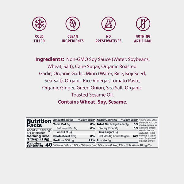 Non-GMO Soy Sauce (Water, Soybeans, Wheat, Salt), Cane Sugar, Organic Roasted Garlic Puree, Organic Garlic, Mirin (Water, Rice, Koji Seed, Sea Salt), Organic Rice Vinegar, Tomato Paste, Organic Ginger, Green Onion, Sea Salt, Organic Toasted Sesame Oil.