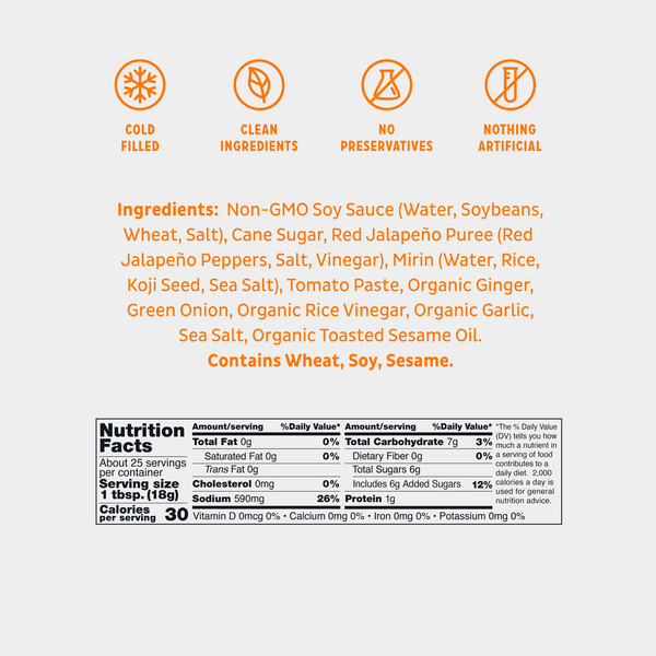 Non-GMO Soy Sauce (Water, Soybeans, Wheat, Salt), Cane Sugar, Red Jalapeño Puree (Red Jalapeño Pepper, Salt, Vinegar), Mirin (Water, Rice, Koji Seed, Sea Salt), Tomato Paste, Organic Ginger, Green Onion, Organic Rice Vinegar, Organic Garlic, Sea Salt, Organic Toasted Sesame Oil.