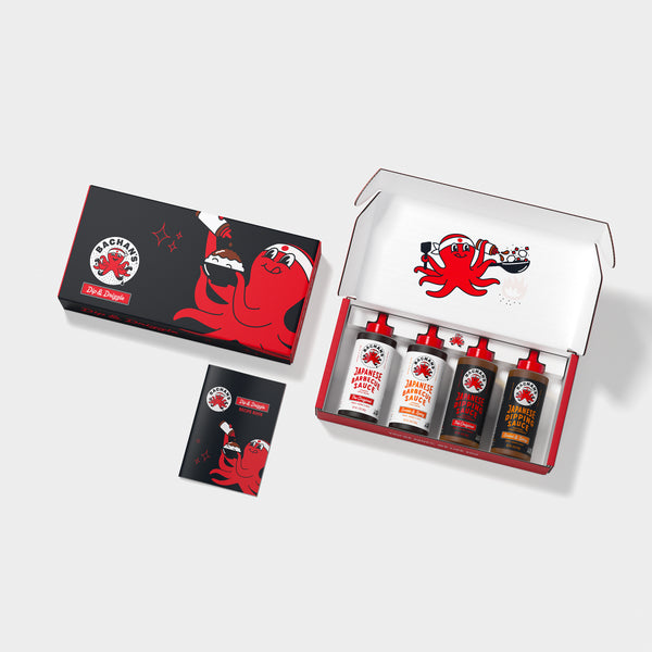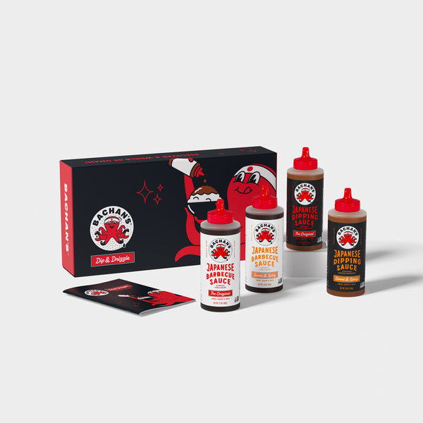 Nobody likes a lonely sauce—especially us. That’s why we put four of our favorites together in this Dip & Drizzle Gift Box. You get our Original and Sweet & Spicy Japanese Barbecue Sauces (perfect for marinating, grilling and drizzling), and our Original and Sweet & Spicy Japanese Dipping Sauces, a Bachan-approved recipe book, and a little red Octo pin to keep them all company. Because just like us, our sauces are happiest when they’re surrounded by family.Â